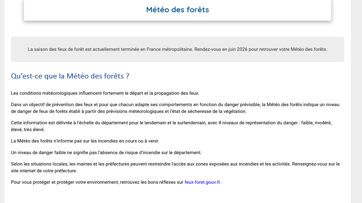 Les conditions météorologiques influencent fortement le départ et la propagation des feux. Dans un objectif de prévention des feux et pour que chacun adapte ses comportements en fonction du danger prévisible, la Météo des forêts indique un niveau de danger de feux de forêts établi à partir des prévisions météorologiques et l’état de sécheresse de la végétation. Cette information est délivrée à l’échelle du département pour le lendemain et le surlendemain, avec 4 niveaux de représentation du danger : faible, modéré, élevé, très élevé.